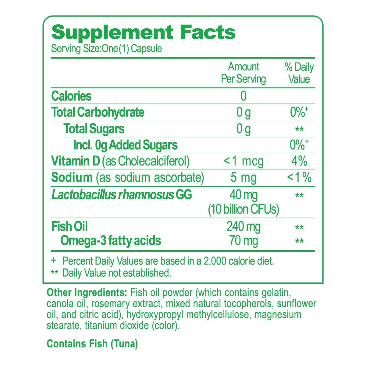 • Culturelle® 3-in-1 Complete Probiotic also contains 240mg of fish oil with heart healthy omega-3 fatty acids.* When taken daily, Culturelle® 3-in-1 Complete Probiotic is safe and effective in supporting heart, digestive and immune health.*